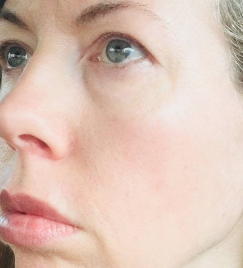 My skin at its worse on the left. The texture was visibly bumpy like an orange peel, but it felt like sandpaper. It was covered in red marks, had an overall redness, and would frequently flush.